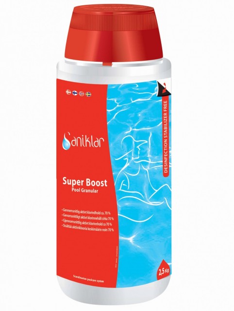Saniklar Super Boost Granulat er et lettløselig klorgranulat basert på kalsiumhypokloritt (ustabilisert klor) og danner derfor ikke klorlås i bassenget. Granulatet er produsert i USA og er drikkevannsgodkjent. Det er din sikkerhet for at kloret er av høyeste kvalitet.